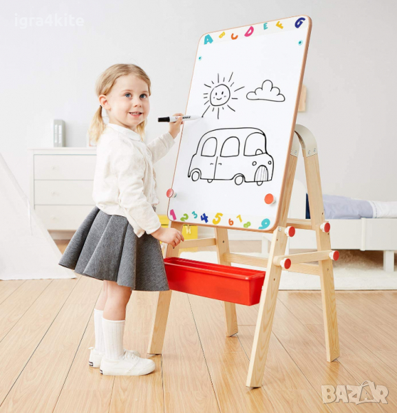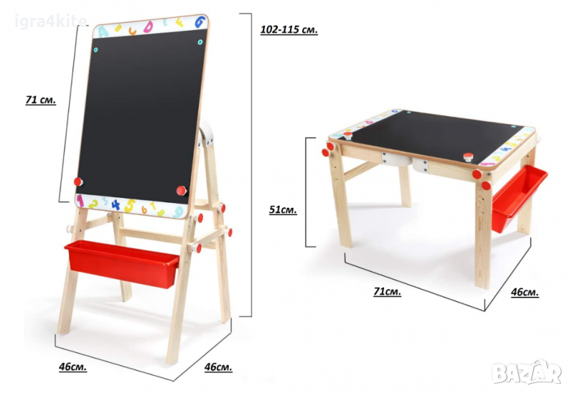 Двустранно магнитни отзад и отпред с черна и бяла повърхност за рисуване с тебешири или писане и полепяне на магнити.