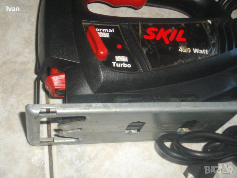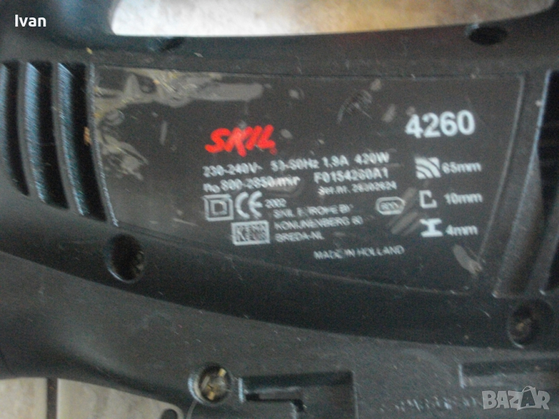 Описание на 420 ватово черно профи холандско зеге - Skil 4260. МАШИНАТА СЕ ПРЕДЛАГА ЗА ЧАСТИ ИЛИ ЗА РЕМОНТ-НЯКОЙ ДА СИ Я ОПРАВИ.РАБОТИ СИЛНО И МОЩНО,НЯМА ИСКРЕНЕ,ВДИГА ОБОРОТИ,НО НА ГЛАВАТА ЛИПСВА СЪЧМАТА,КОЯТО ЗАДЪРЖА ДВИЖЕНИЕТО НА НОЖА-СИСТЕМАТА КЛИК-КЛИК НЕ РАБОТИ ЗА ЗАДЪРЖАНЕ-НОЖА ИЗПАДВА СВОБОДНО.Вертикален прободен трион,професионален модел на Скил.Холандско оригинално производство.Марка и модел-Skil 4260.Машината е като нова-почти неизползвана.Работи много добре-силно,мощно.Мощност на мотора-420 вата,1,9 ампера,обороти-от 800 до 2850 в минута,регулируеми с 6 степени.Двустранна авто защита на спусъка пре работа.Дълбочина при рязане в дърво-65 мм,в алуминий-10 мм,в желязо-4 мм.Наличие на дълъг конектор на отпадъчният прах за директно скачване в прахосмукачка или торба за прах.Система клик-клик на работният плот за бързо вадене-с 1 движение-за снемане на плота при работа в трудно достъпни места.Машината е клас Турбо-за праволинейно и обикновено ряззане.Система клик клик за бърза сменяемост на режещият нож.Забележка-поставях от двата вида ножове с Т образен и У образен захват-не стоят добре-излизат.Системата работи за ножа,придвижва се назад при поставяне, но ножа излиза.