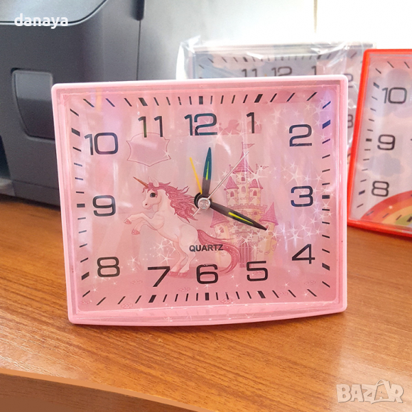Симпатичен детски настолен часовник с аларма с различни картинки на еднорог. Будилникът е подходящ за детска стая или всекидневна. Аналогов дисплей, пластмасов корпус. Циферблата има големи цифри, лесно виждащи се и отдалеч. Предлага се в кутия и е подходящ за подарък. Работи с една АА батерия (не е включена в комплекта).