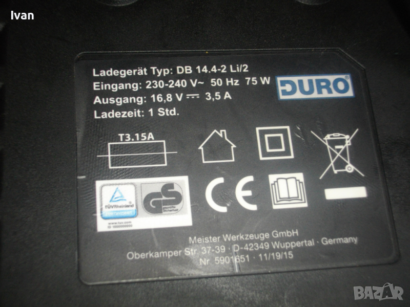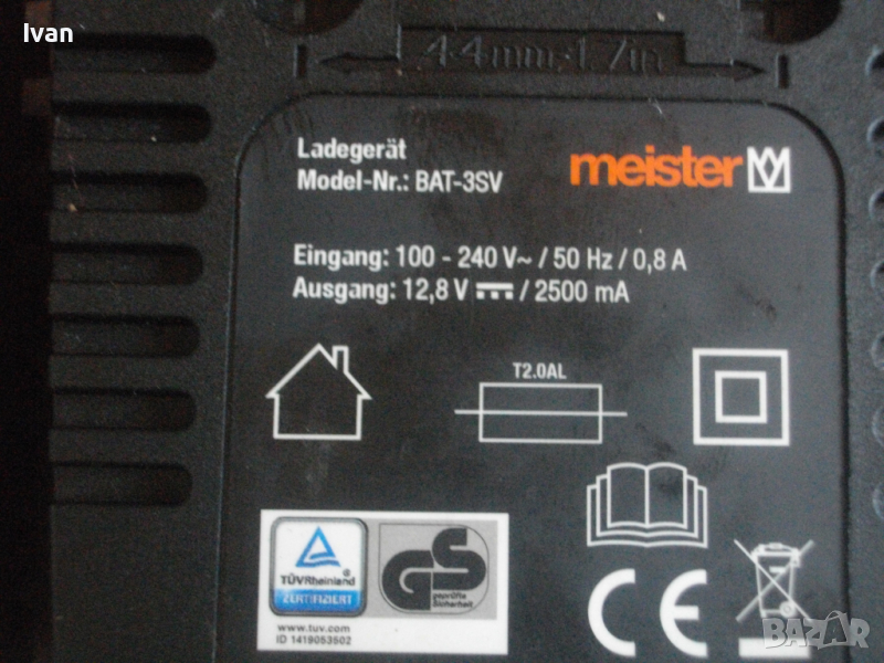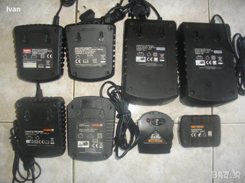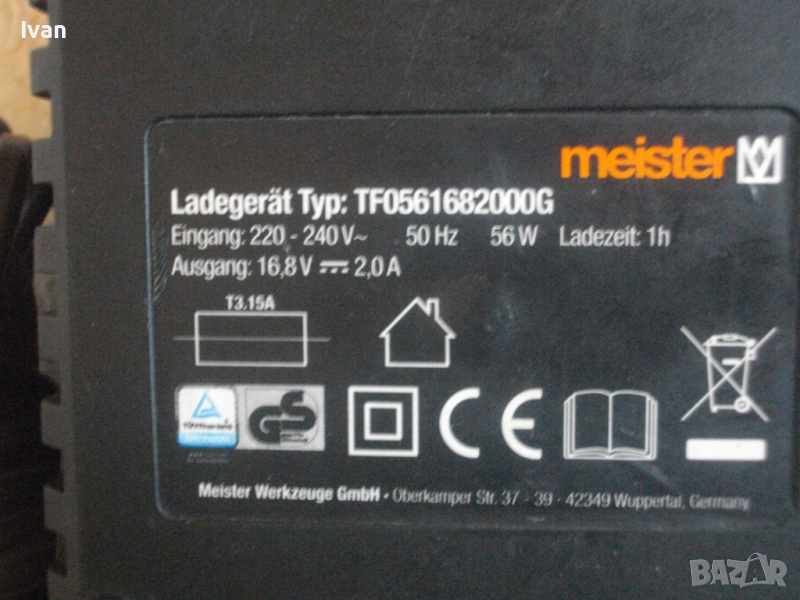 ОПИСАНИЕ НА 16,8 ВОЛТОВО ЛИТИЕВО ТИП ШЕЙНА ЗАРЯДНО НЕМСКО НОВО - МЕЙСТЕР - ЦЕНА 49 ЛВ:Съвсем ново, неупотребявано литий-йонно зарядно за батерии 18,8 волта тип шейна на марката Мейстер. Има съвместимост и сд други определени батерии на немският концерн Мейстер. Марка и модел на зарязното - Meister Typ TF0561682000G. Производство -п оригиналон Германия - Germany- упоменато на маркировките. Отлично техн. състояние. Зарежда много добре, без да затопля корпуса. Мощност - 56 вата ,волтаж - 16,8 волта за батерии 16,8 волта, 2,0 ампера защита, време на пълно зареждане на добра батерия - 1 ч.За атерии тип шейна с две метални букси за зареждане. Две светлинни индикации - зелена - червена. Евро щепсел. Захранване - 220 волта.