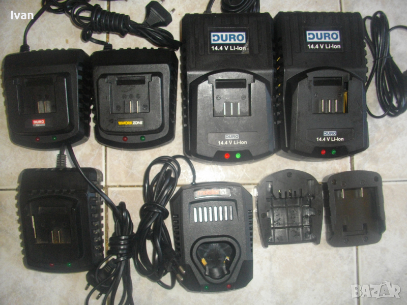 Зарядните са за литий-йон 18 волтови батерии, тип шейна - система клик - клик, с приплъзване. Съвсем нови, в отлично техн.състояние. Производство на зарядните - оригинално германско 2018 г. - Germany, упоменато на маркировките. Номинал на зарядните - 21 V - 2,5 mA. Характеристики - 21 волта, за батерии до 2500mA, отдаван заряд - 400 mA, импулсен. Време на пълно зареждане на батерия - 90 мин. за зарядното Duro, 60 мин. за зарядното - Workzone. Две светлинни индикации - зелено - червено. Две клеми за зареждане. Клас на зарядните - 5S.