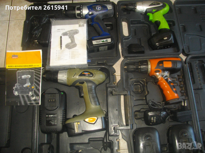 Литий-йонни18 волтови акумулаторни бормашини-винтоверт-дрелка.Белгийска марка и лиценз.Производство-PRC.Марка и модел на машините-Constructor CTC18Li-1100-BM.Винтовертите са нови .Работно състояние - батериите са паднали до дъно и не тръгват да се зареждат.