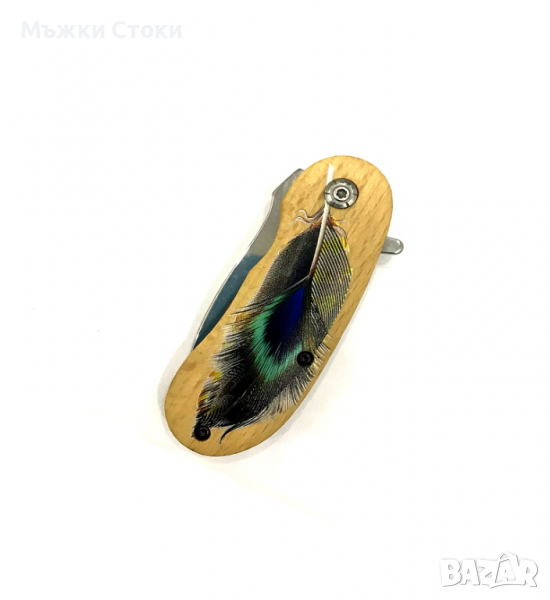 Страхотно джобно ножче за всякакъв повод - пикник,риболов.Страхотен дизайн и лазерно заточен.Може да го носите на всякъде с вас.Дръжката е изработена от дърво.Отзад има пластина за захващане на колан.