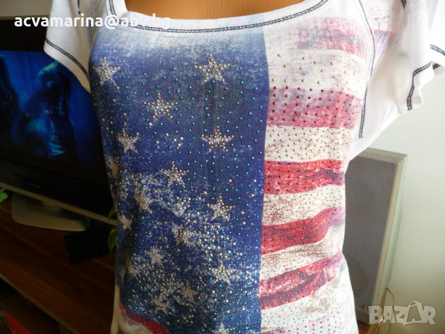 Свежа тениска в отлично състояние и без следи от носене . На принта отпред има миниатюрни капсички ,които искрят при попадане на светлина върху тях . Купувана е от Англия .