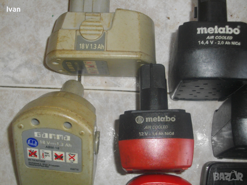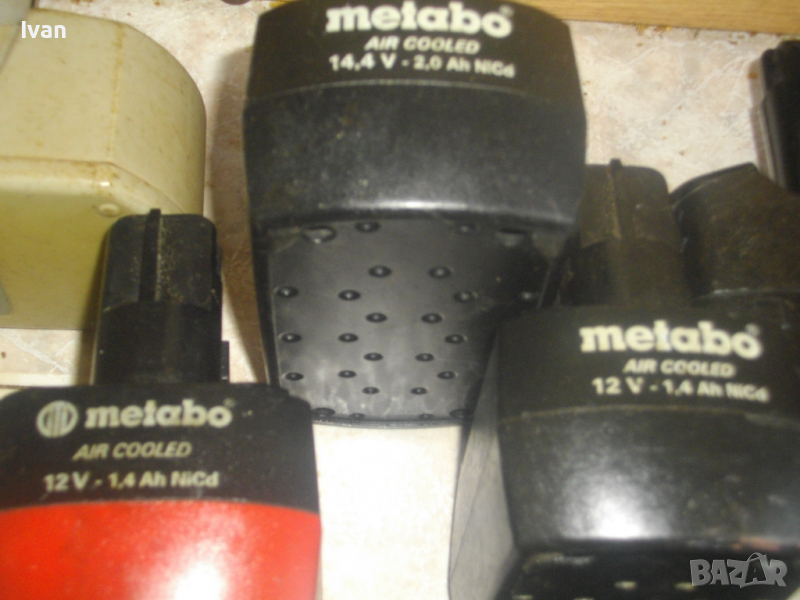 ОПИСАНИЕ Metabo 12 V -1,4 A - налични 2 бр. Описание на Metabo Air Cooled 12V-1,4Ah Ni-Cd.Цената е за 1 бр. батерия - 39 лв.Професионални червена и черна батерии на Метабо,с дишаща основа,за винтоверти и акумулаторни машини на марката.Марка и модел на батериите-Metabo Air Cooled 12V-1,4Ah Ni-Cd.Имам и по 1 бр от същата серия-2,0 ампера-червена и черна..Батериите са производство-Чешка Република.Елементи-никел-кадмий. НЕ СА ДОБРИ - зареждат се СЛАБО, въртят СЛАБО , НЕ задържат заряд.Запазен външен вид.