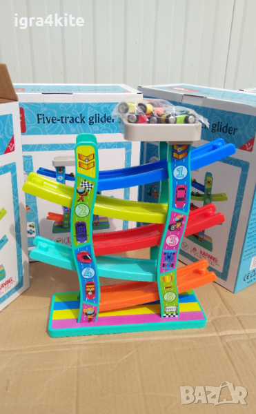 Занимателна и увлекателна детска игра на 5 нива със 5бр. цветни колички.