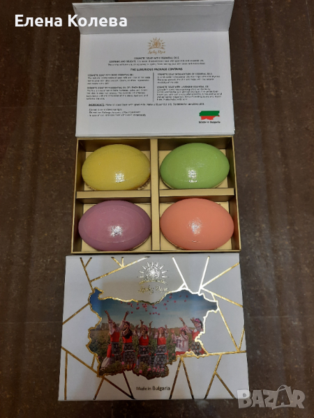 Деликатни и с успокояващи свойства сапуните са произведени от натурална сапунена база с козе мляко и етерични масла. Подходящи за чувствителна кожа. Комплектът включва четири натурални сапуна – с етерично масло от роза, маточина, лавандула и смес. Да не се съхраняват на пряка слънчева светлина.