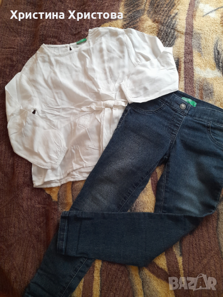 Лот за момиченце BENETTON, за възраст 5-6 г. Дрехите са изпрани, но не са носени. Дънките са ластични, тип клин. При инерес давам точни мерки.