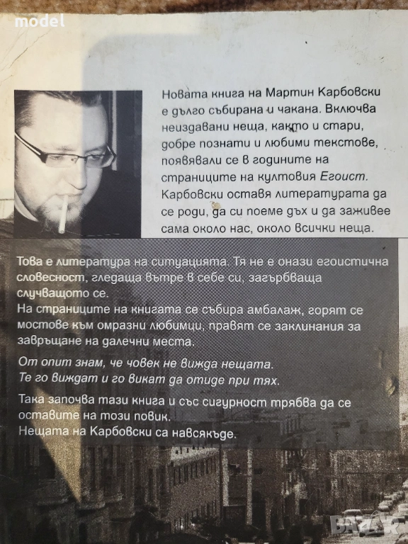 Книгата „Нещата” на Мартин Карбовски предизвика странни и очаквани реакции. Както винаги, светът се подели на „ЗА” и „ПРОТИВ” с това изключение, че някои хора щъкаха между двата лагера непрекъснато. Един ден те съскаха срещу книгата и нейната отвратителна и пошла „илюзия”, а на следващия удряха с юмрук в старата дървената маса и крещяха псувни срещу новия проектозакон. Каква е разликата, господа? Разликата е, че едно е някой да ти каже, че си простак, друго е да се биеш в гърдите и да крещиш с пълно гърло: „Простак съм и се гордея с това!”. А Карбовски дори не обижда никого с последната си книга, напротив, защитава ни.