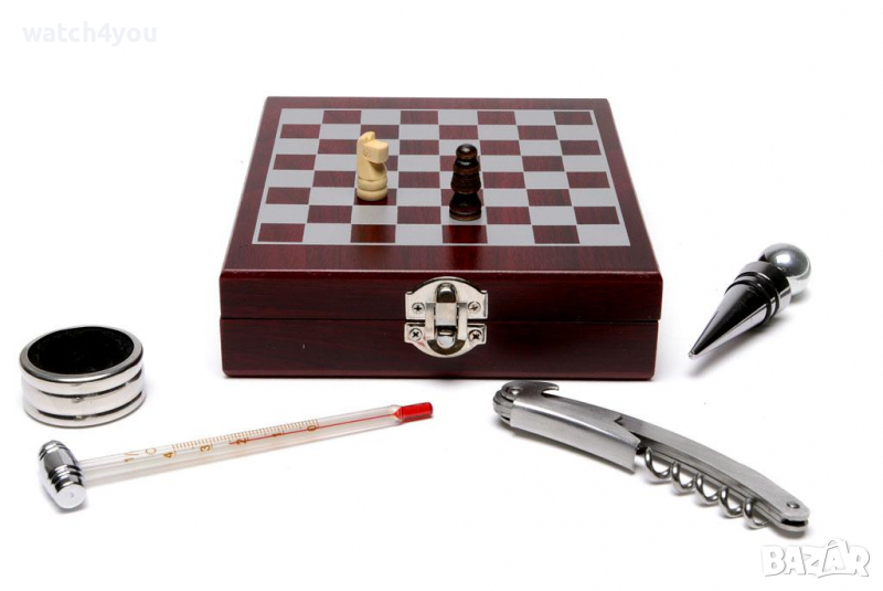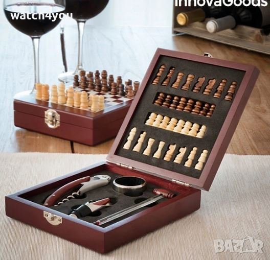 НОВ КОМПЛЕКТ ЗА ВИНО В ЛУКСОЗНА ДЪРВЕНА КУТИЯ 4 БРОЯ АКСЕСОАРИ. ШАХ. ШАХМАТНА ДЪСКА 2V1. СЕТ ЗА ВИНО