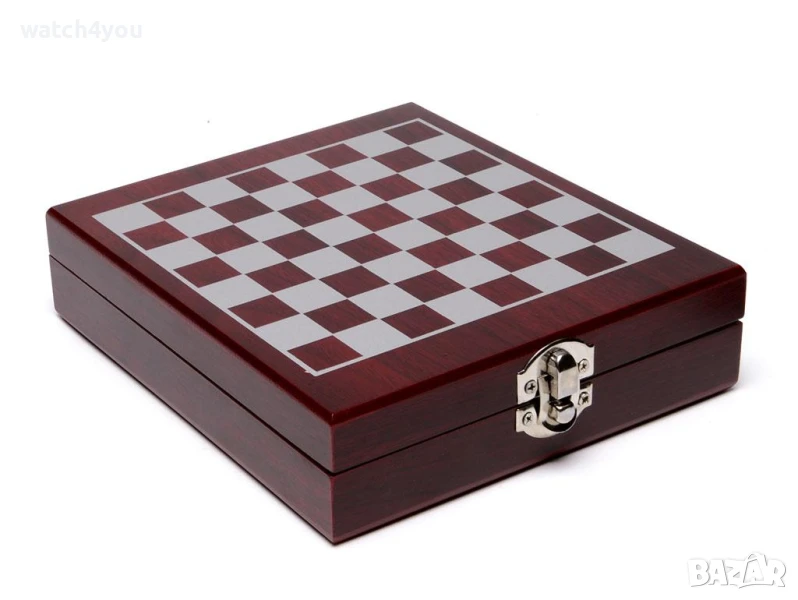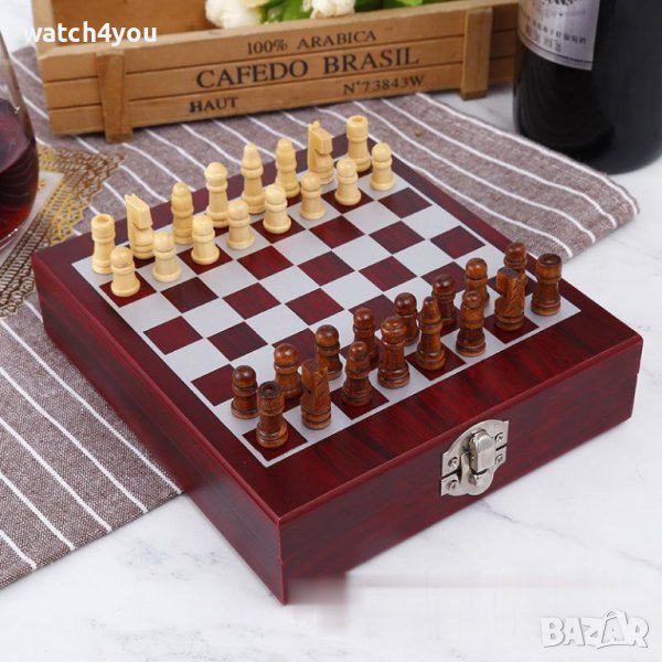 дървен шах с луксозен сет за вино! Идеален за партита и тържества, тъй като е едновременно игра на шах и пълен набор от аксесоари за вино.