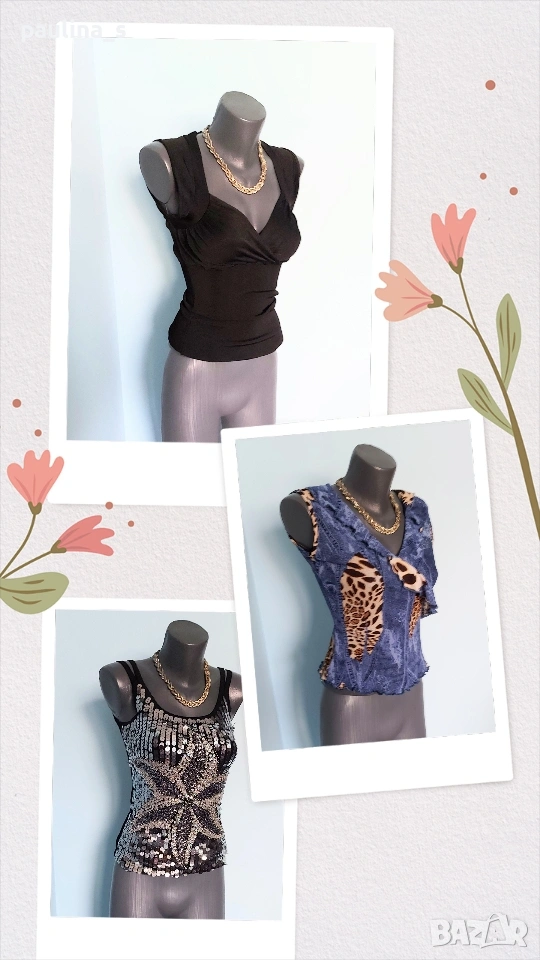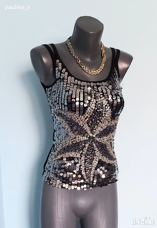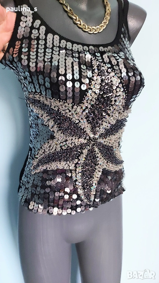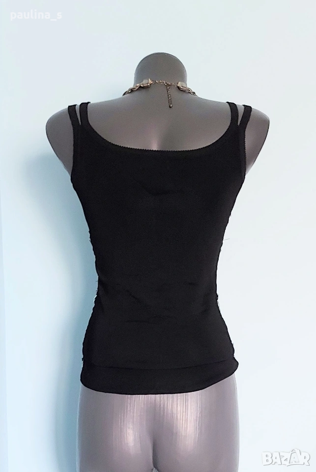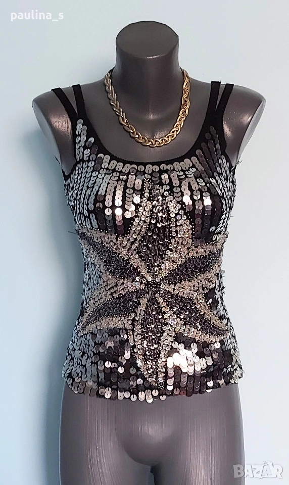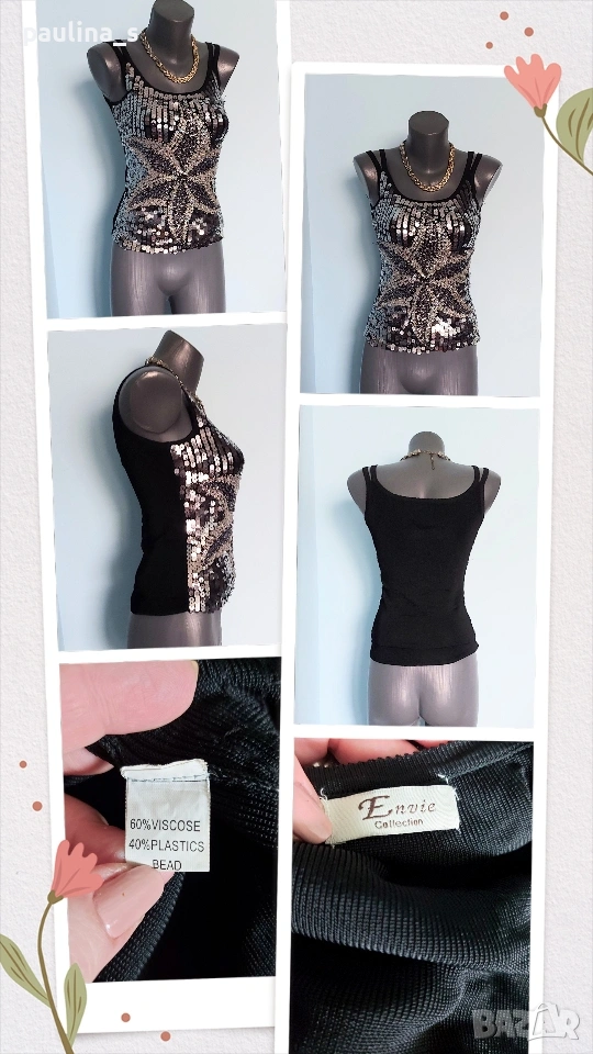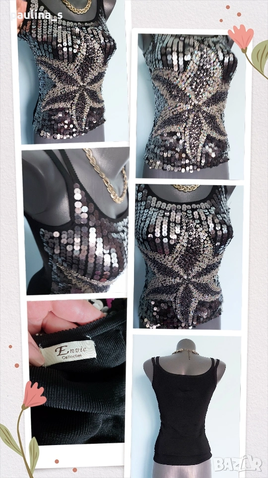 1️⃣. Колаж / L / 2XL "Envie" - Една бройка! Цената е крайна, без пазарлъци 20 евро. Уникален дизайнерски топ / Бюстие с богата ръчно изработена декорация. Материята е трико от вискозна коприна и ликра с кожен ефект, много еластична и покрива няколко размера. Моделът е семпъл, с двойни презрамки. Като ново, без дефекти и етикет!