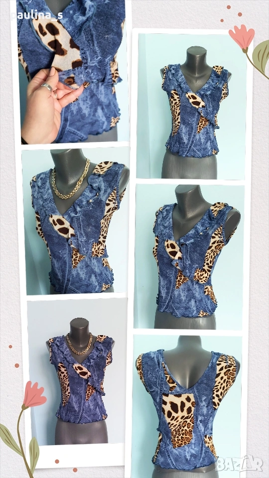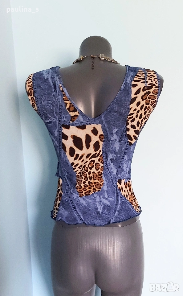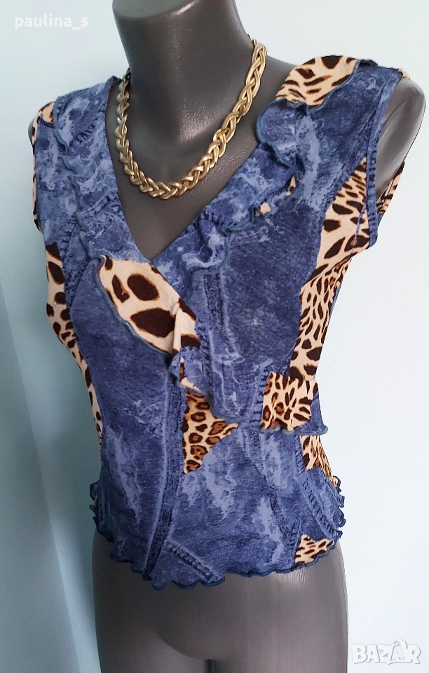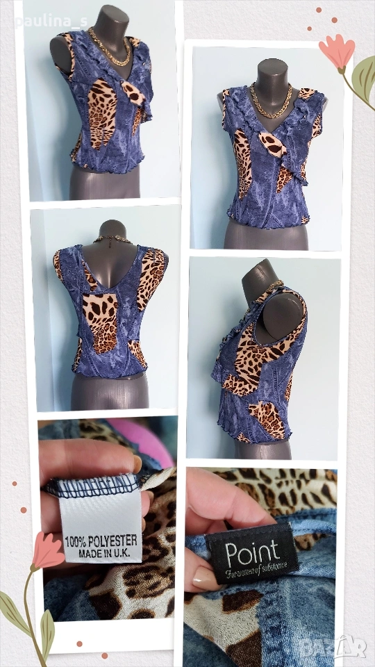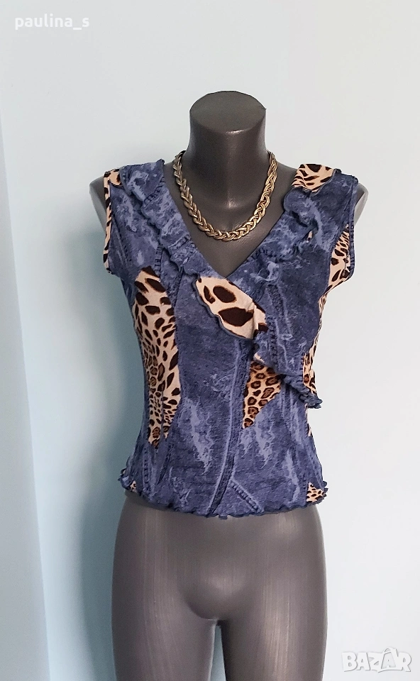 2️⃣. M / 2XL - "Point" for women of substance. Цената е крайна, без пазарлъци 15 евро. Разкошен марков топ, бюстие или потник - изборът е ваш. Принтът е миксиран от дънков и животински, декорациите са от рюшове и волани. На живо е мноого атрактивен артикул, приковава погледите. Материята е ликра и гали кожата, а принтът очите. Нов, без дефекти и етикет, една бройка, има еластичност и покрива няколко размера, посочени са.
