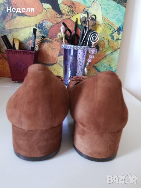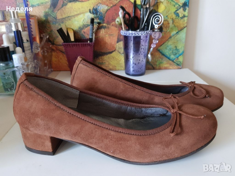 Обувките са естествена кожа велур. Испански ,купувала съм ги от интернет , не улучих размера. Обувани са само в къщи за проба. Дължина на стелката 23.5. кожата е мека и удобна