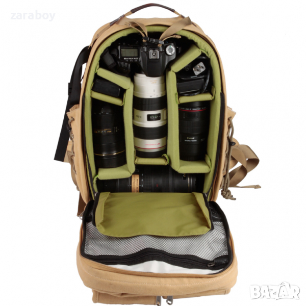 - Място за допълнителни обективи, светкавица и аксесоари.