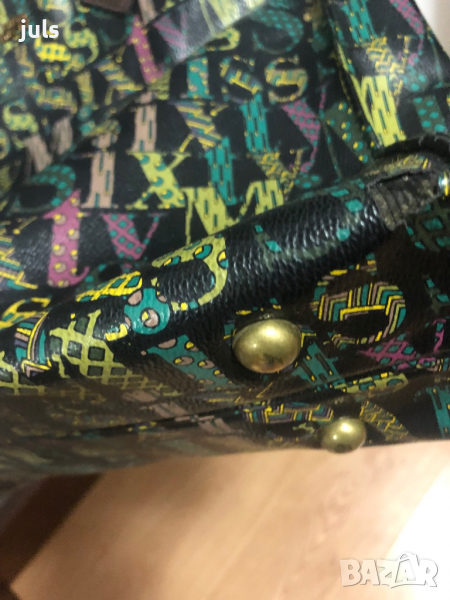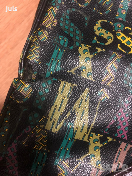 Чантата има забележки: кожата на места е напукана по ръбовете и на някои сгънки, но тъй като е многоцветна, забележките не се набиват на очи. Може би кожар или шивач ще може да ги поправи. Вътре подплатата на чантата е здрава. Приложени са и снимки. Продава се на чисто символична цена.