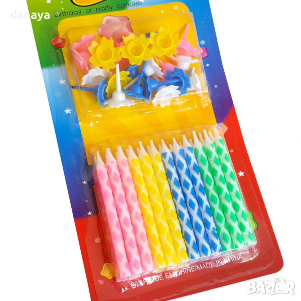 Цветни свещички за торта с поставка за всяка свещичка. Разноцветни свещички за рожден ден, 24 броя в комплект. Ярки и привличащи погледа цветове свещи за торта.