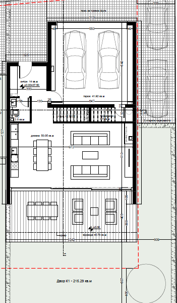 На първия етаж са разположени- входно предверие (14 кв. м), дневна (50.05 кв. м), тоалетна (2.8 кв. м), гараж (41.92 кв. м), техническо помещение (3.65 кв. м). Конструктивна височина на етажа е 3.30 метра, а светлата височина 2.95 метра. Застроената площ на етажа е 130.38 кв. м.