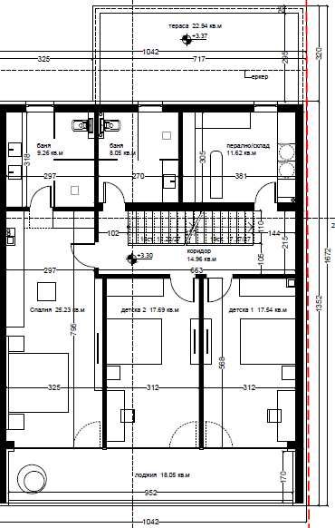 На втория етаж са разположени - коридор (14.96 кв. м,), спалня (25.23 кв.м) с баня (9.26 кв.м), баня (8.05 кв. м), детска стая (17.54 кв. м), детска стая (17.69 кв. м).