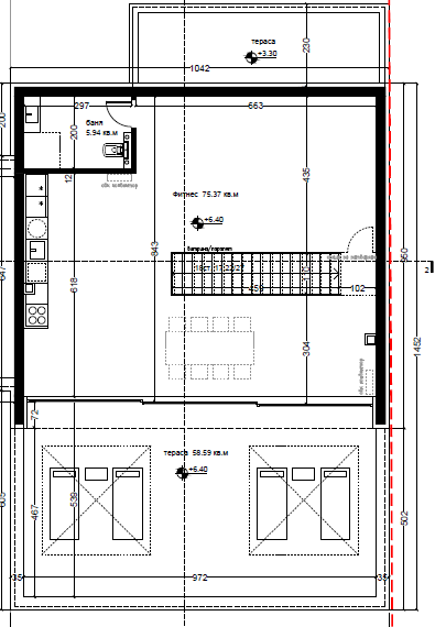 На третия етаж са разположени - фитнес (75.37 кв. м), баня (5.94 кв. м), тераса (58.59 кв. м). Конструктивна височина на етажа 3.10 м, а светлата височина е 2.75 м. Застроената площ на трети етаж е 151.3 кв. м.