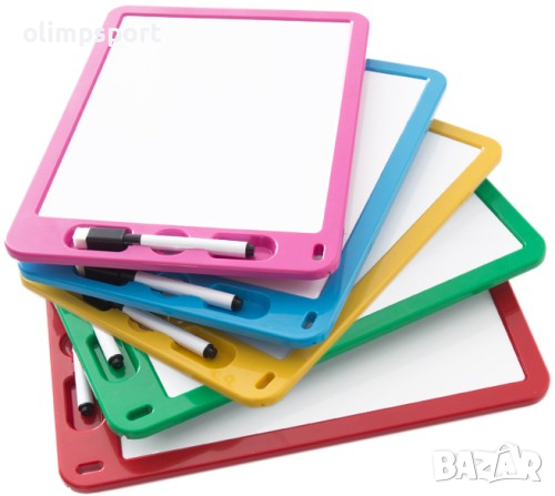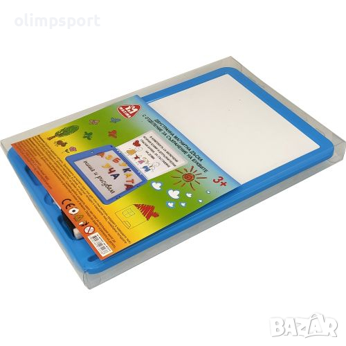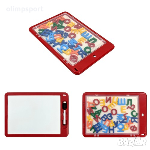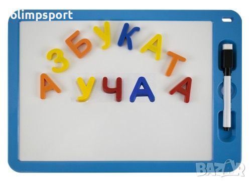 Комплект двустранна магнитна бяла дъска с букви и маркер с гъбичка . Може да се пише с маркер за бяла дъска и да се редят магнитните букви, и от двете страни. Дъската разполага с капак, който предоставя възможност за съхранение и пренасяне на буквите, когато не се използват. Включени са всички букви от българската азбука (по веднъж) и допълнителни гласни за съставяне на думи. Комплектът е подходящ за деца над 3 години. Площ за писане – 24.5х17.5 см и 25.5х18.5 см. Размери дъска – 31х21.5х2.5 см. Размери кутия – 31.5х22х3 см. Височина букви - от 30 мм до 41 мм. Тегло за комплект – 380 г. Тегло с опаковката – 460 г.