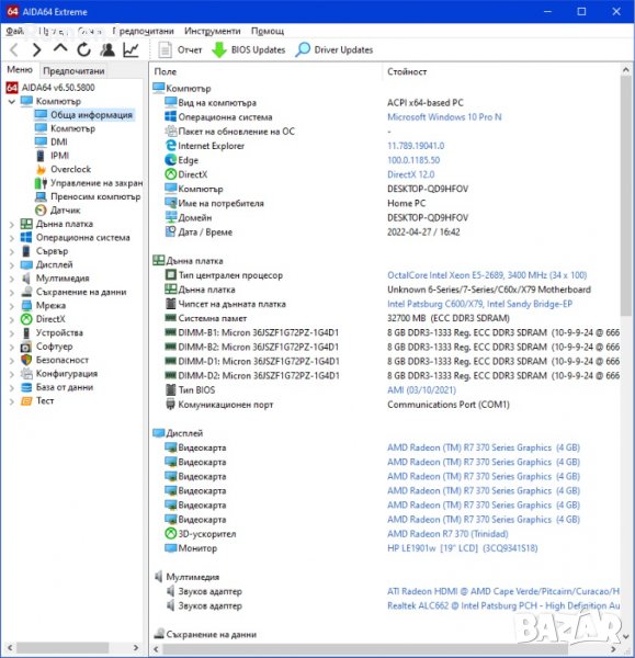 Продавам компютър X79, осемядрен Е5-2689, 32GB RAM, Sapphire 4GB,DDR5, 256bit, SSD XPG 256GB+1TB HDD