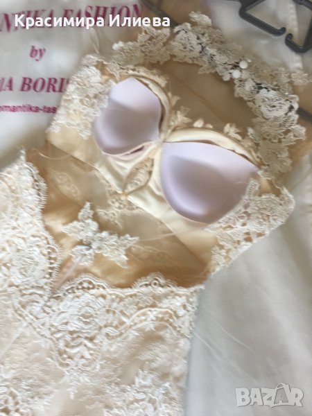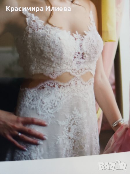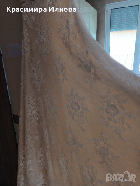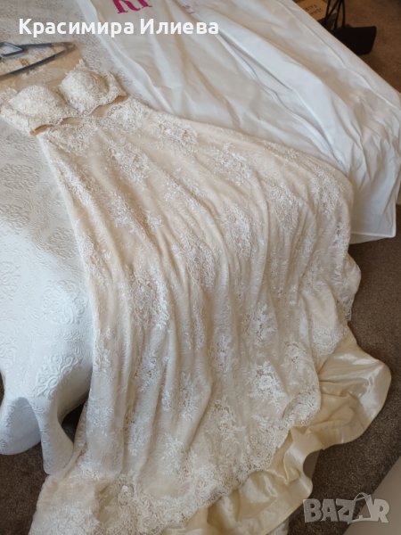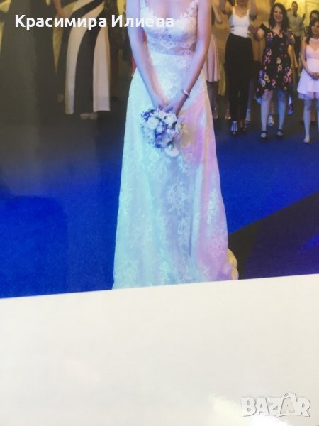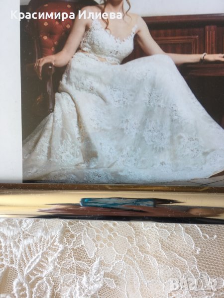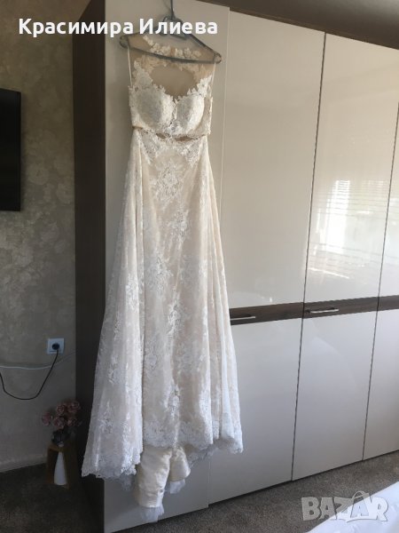 Булчинска рокля на SB,много красива и стилна.Дантелата е бяла ,а фустанелата е екрю,резултатът е цвят ейвари за роклята,не е снежнобяла..Има леки забележки ,които могат да оправят вкъщи,не е нужна шивачка.Много изящна и впечатляеаща.Мерките на булката са 176см височина,59 кг.Вграденият сутиен е за 75 В,но подплънките се свалят,.Роклята има шлейф и е за обувки с ток 12 см.Гърбът е гол и талията е малко висока.Има малки кристалчета ,пришити около бюста .Купена е за 2880 лв от бутика на дизайнерката.