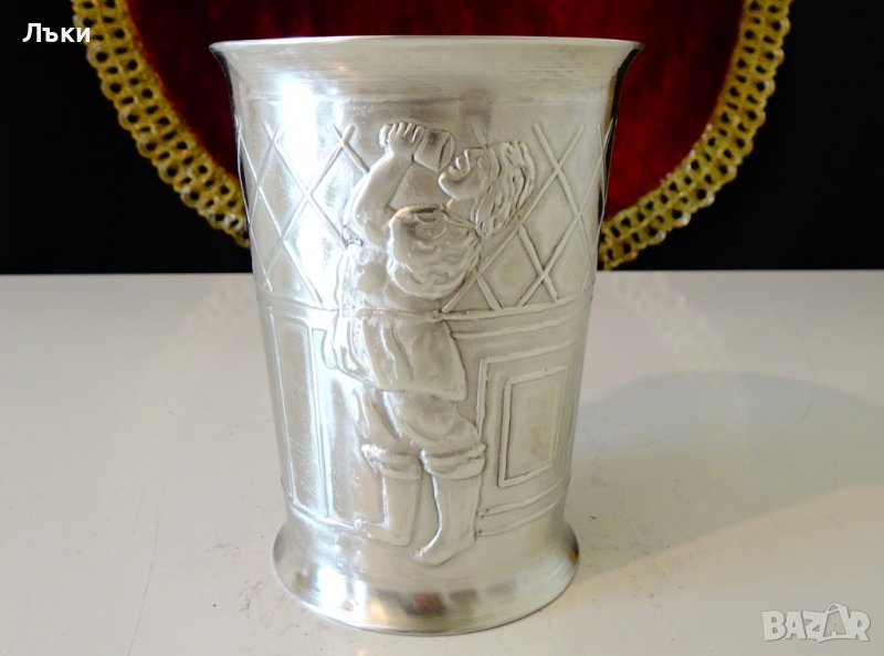 ръчна изработка от калай 95% и сребро 5%.Декорирана с оригинална релефна картина – Юнак вино пие,а млада домакиня носи пълна кана с още винце.Високо качество със блясък на сребро.Височина 9.5 см.,диаметър 7 см.,тегло 140