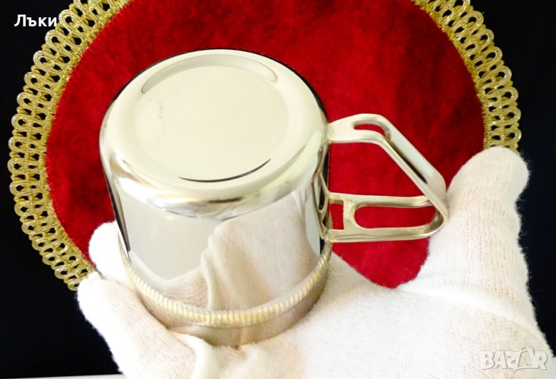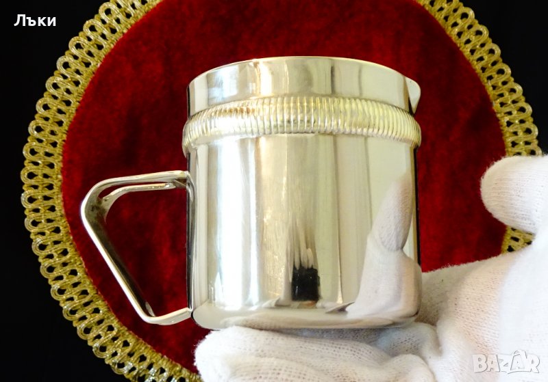 месинг,външно посребрена с висока проба сребро,родирана за блясък.Декорирана с красив релеф.Височина 7 см.,диаметър 6.5 см.,тегло 120 гр.Вместимост 160 мл.