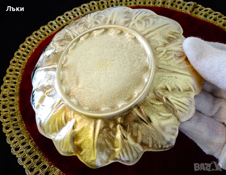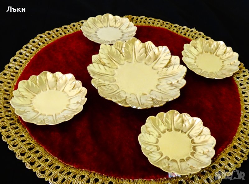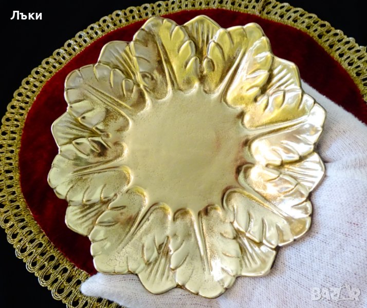 Старинна английска чиния,подложка,купичка,майсторска ръчна изработка от масивно отлят бронз с релефни листенца и златен блясък.Диаметър 14 см.,височина 2 см.,тегло 270 гр.