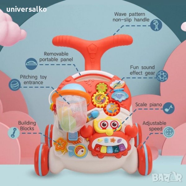 Играчката спомага за лесното прохождане и развива координацията и фината моторика.
