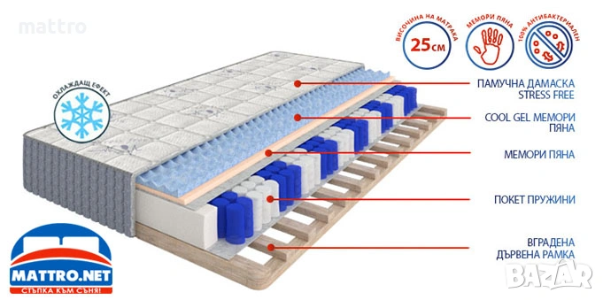 За да се чувствате удобно докато спите, е изключително важно тялото да е в оптимална позиция. Ето защо специалистите от матраци Mattro са вложили покет пружинен пакет в ядрото, в комбинация със слоеве мемори пяна (2 см) и профилирана Cool Gel пяна (2 см) в горната част на матрака. Покет пружините предлагат стабилна и ортопедична поддръжка на тялото, а комбинацията от двата вида пяна гарантира високото ниво на удобство. Мемори пяната е характерна със свойството да реагира на телесната температура и да възприема извивките на тялото, а профилираната Cool Gel мемори пяна съдържа охлаждащи гел капсули, които придават свежест по време на отмора. Този тип пяна е със специален профил, чрез който е постигнат и ефект на масаж.