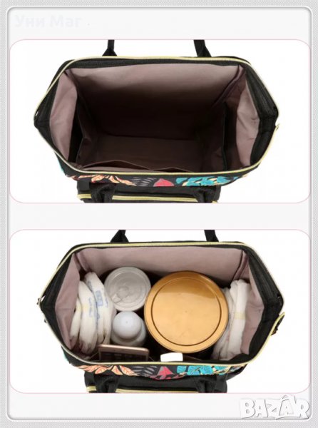 Основното отделение е просторно и се затваря с двоен цип. Може да побере всички важни неща, от които се нуждае Вашето бебе, като бутилки, памперси, увити дрехи, кърпички, играчки и др.
