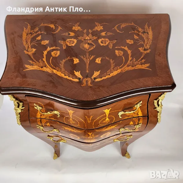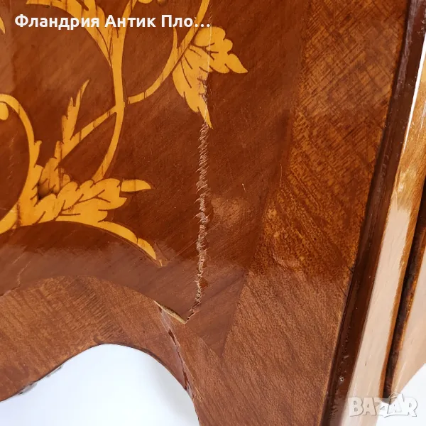 Изящна изработка от масивно дърво, облечено във фурнир с инкрустация и месингов обков.