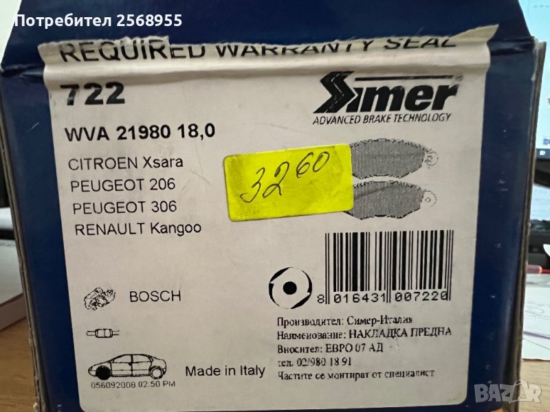 SIMBER 722 Накладки предни CITROЕN Xsara / RENAULT Kangoo / OE 7701206811 / OE 425305 / OE 172082 /