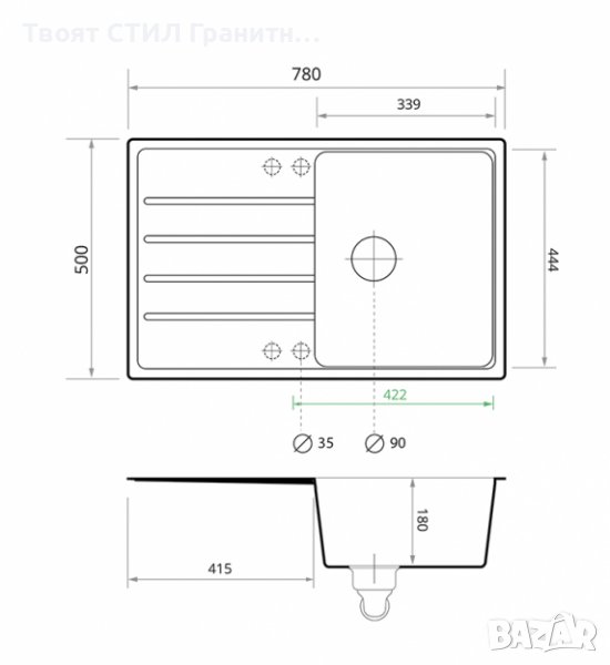 ТОП Кухненска Мивка от гранит модел Копенхаген Smart 780 x 500 mm - Графит