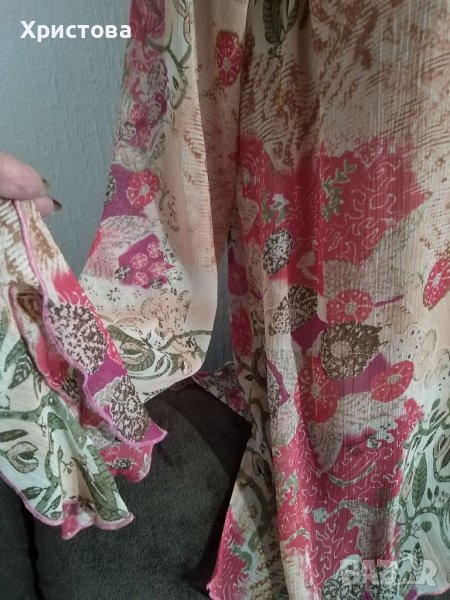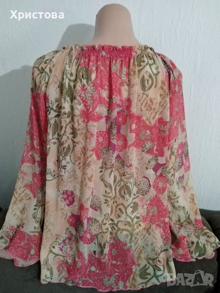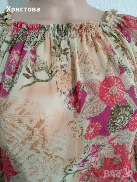 Цветна ефирна блуза със 7/8 ръкав, с къдри по края. С еластично деколте, позволяващо носене със свалени рамене. Ръкавът е реглан, дължина 59 см от ластика на деколтето. Дължина на блузата 64 см, ширина от мишница до мишница 54 см, в долния край 57 см (с цепки отстрани). Не се мачка. По етикет е М, но свободната кройка позволява L. Нова, без етикет.
