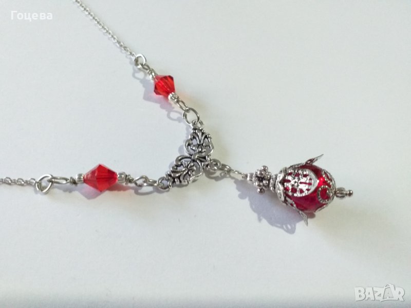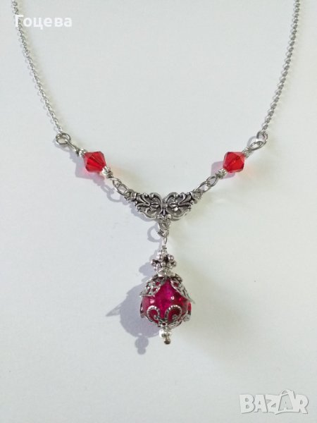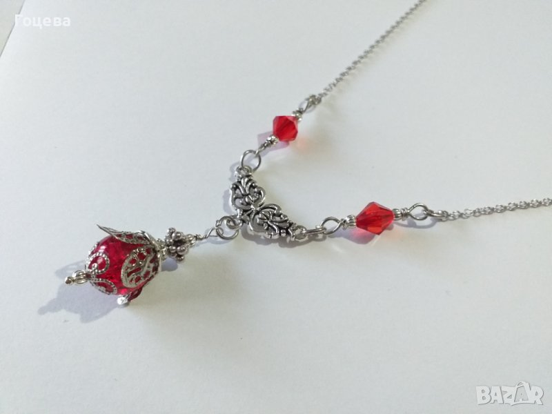 Красиво колие във Викториански стил в рубинено червено и изящни орнаменти в цвят Сребро