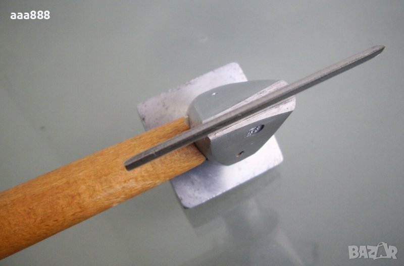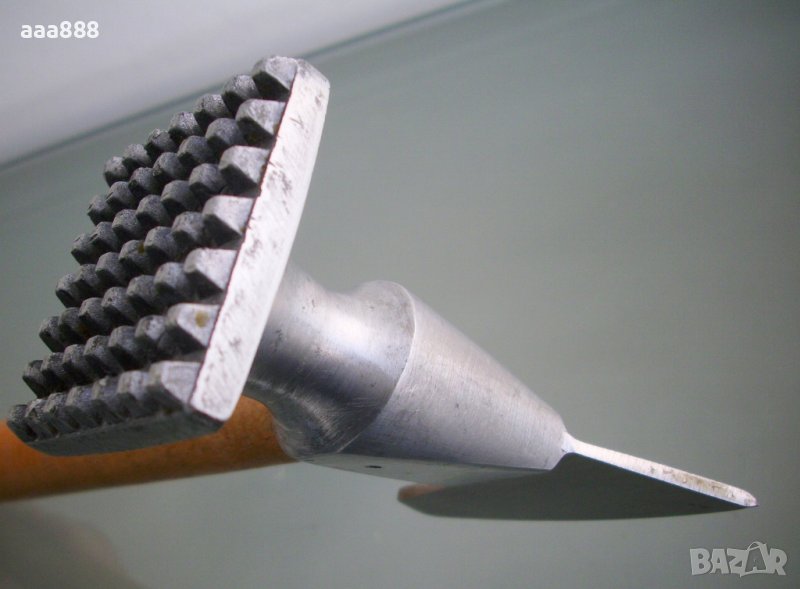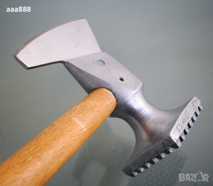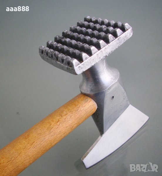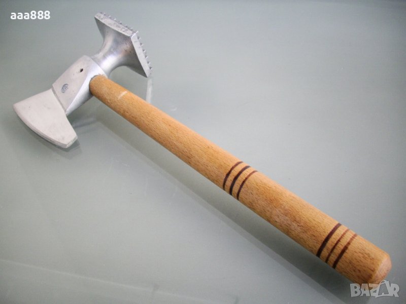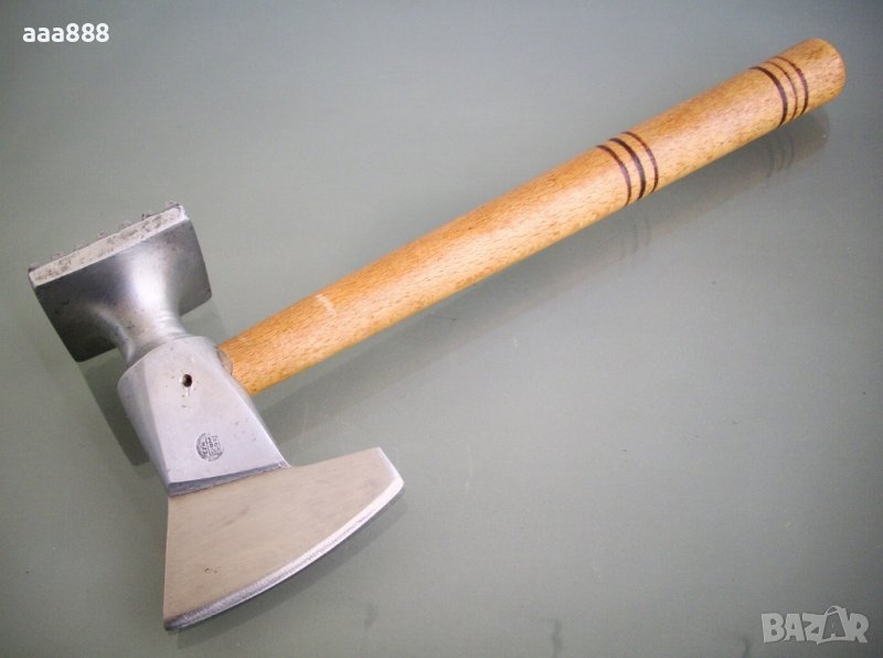 Кухненски сатър с чук за сечене, кълцане и начукване, направен от неръждаема стомана и алуминиева отливка, здраво занитен в букова дръжка. Производство на „CZM DOMGOS“, Полша. Режещият ръб е двустранно заточен, широк 3 мм. Дръжката е лека с удобен захват. Сатърът е подходящ за съдомиялна машина. Нов, неупотребяван, с отлично качество.
