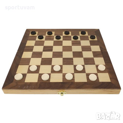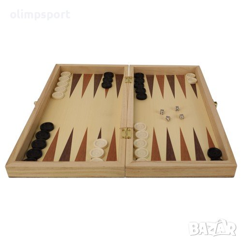 Комплект 3 в 1 класически настолни игри - шах, дама и табла, дървен с интарзия от фурнир. Комплектът съдържа дървена кутия, дървени шахматни фигури с размери от 2.7 до 5.4 см, пластмасови пулове с диаметър 2 см, пластмасови зарчета. Размери на таблото – 29х29 см. Размери на таблото затворено - 29х14.5х5 см. Материал дъска и фигури за шах - дървесина. Материал пулове за табла и зарчета - PVC. Размер цар - 5.4 см. Размер пешка – 2.7 см. Диаметър пул - 2 см. Тегло за комплект - 600 г. Дъската е изработена от естествен материал, възможно е да има разлики в нюансите на цветовете на фурнира на отделните квадратчета.