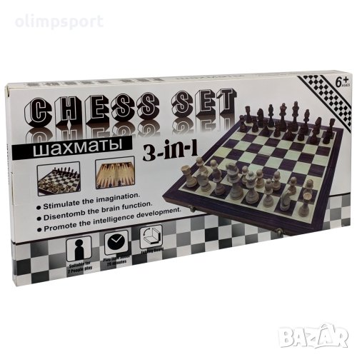 Комплект 3 в 1 класически настолни игри - шах, дама и табла, с интарзия от иглолистна дървесина. Комплектът съдържа дървена кутия, дървени шахматни фигури с размери от 5 до 9 см, пластмасови пулове с диаметър 3.2 см, пластмасови зарчета. Размер на игралното поле на таблото – 49.5х49 см. Размер на таблото затворено - 49.5х24.5х5 см. Материал табло - иглолистна дървесина. Размер цар - 9 см. Размер пешка – 5 см. Диаметър пул - 3.2 см. Фигурите за шах разполагат със защитна лепенка от долната страна против плъзгане. Тегло нето за комплект - 1.4 кг. Тегло бруто за комплект - 1.5 кг. Дъската е изработена от естествен материал, възможно е да има разлики в нюансите на цветовете на фурнира на отделните квадратчета.
