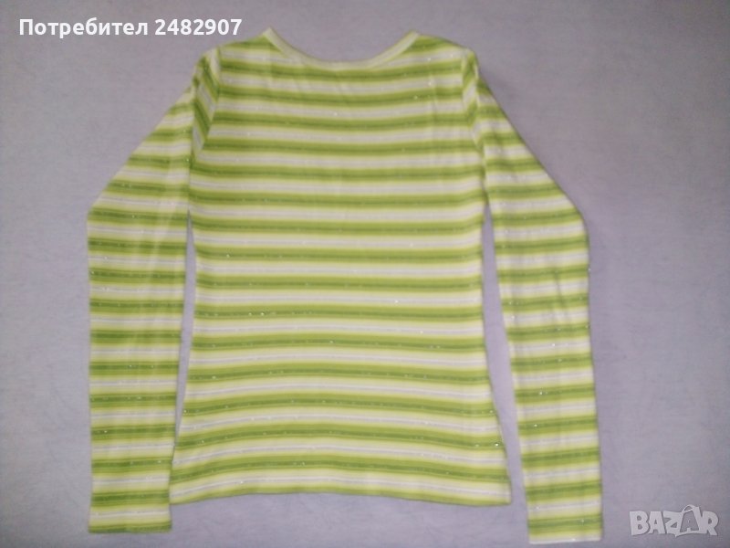 Дамска блуза от трико в зелено и бяло с надпис и блестящи нишки, размер XS. Много запазена.