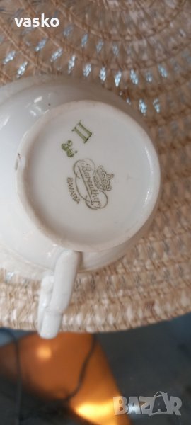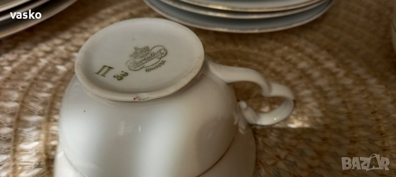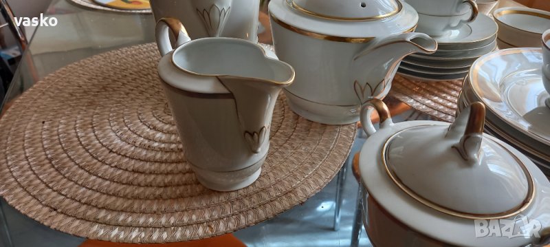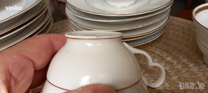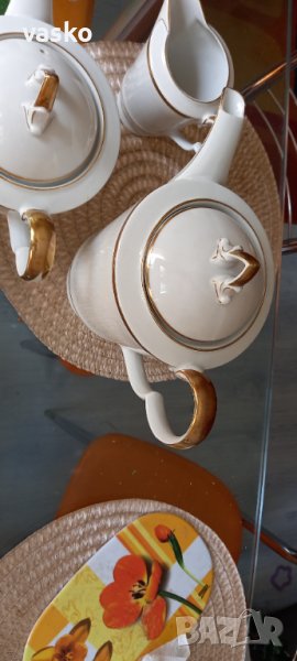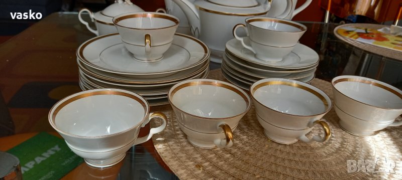 Продавам сервиза от снимките-BAVARIA,костен порцелан,на места позлатата е изтрита-все пак е стар и е ползван.Включва:6 чаши за кафе с чинийки+6 чинийки за торта+кана за чай+кана за кафе+захарница+кана за мляко.Всичко е маркирано,костен порцелан.1 ЧАШКА ИМА МАЛКО ПОДБИТО ОТДОЛУ-СНИМАНО Е.ЦЕНАТА Е ЗА ВСИЧКО.
