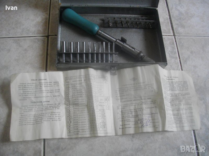 Към комплекта е налична оригиналната съветска книжка-указания - на руски език - паспорт на отвертката, с описание на различинети размери накрайници в комплекта и технически схеми, както и правила за правилна ескплоатация и употреба на инструменталиума.