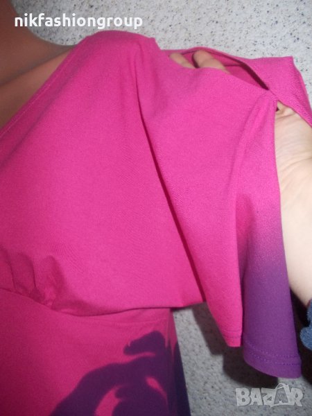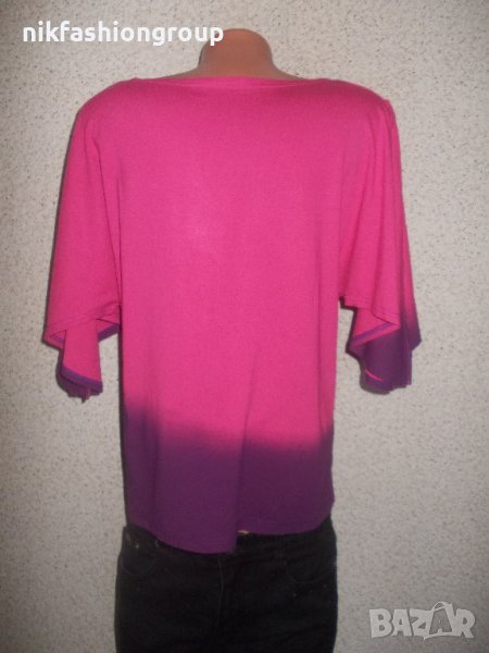 Материята е 90% вискоза и 10% еластан. Блузата е леко еластична. Не е нова, но няма никакви следи от употреба. В отлично състояние е. С много интересен ръкав е. В долната си част е нацяло отворен, а в горната част е пришит и се образува прорез. По етикет блузата е 42 размер, което отговаря на Л размер. Размерите са показани на снимка.