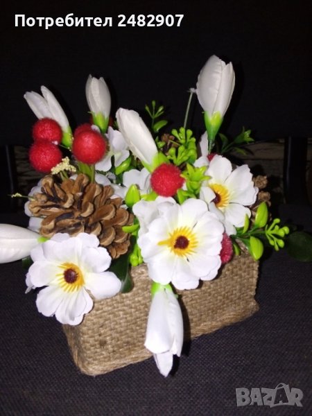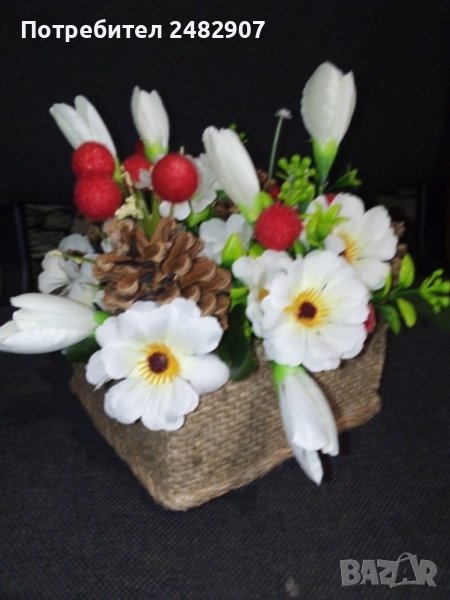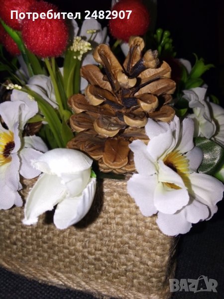 Красива цветна декорация в дървена кутия. Ръчно изработена от природни материали и декоративни изкуствени цветя. Размери на кутията - 12/12 см, височина - около 15 см. Подходяща, както за декорация, така и за подарък