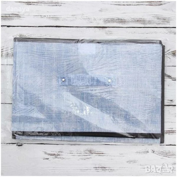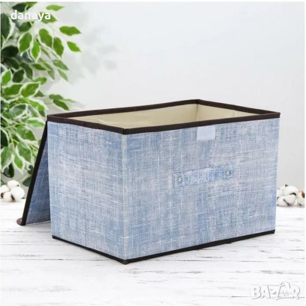 Текстилна сгъваема кутия за съхранение на дрехи и аксесоари в небесно син цвят. Чудесен органайзер за гардероб с широко приложение – може да се използва като кутия за съхранение на канцеларски материали, ученически пособия, бельо, дрехи, които са извън сезона и т.н. Компактен размер, кутията може да се сгъва и не заема почти никакво място в сгънато положение. Това позволява да се използва и при пътуване.
