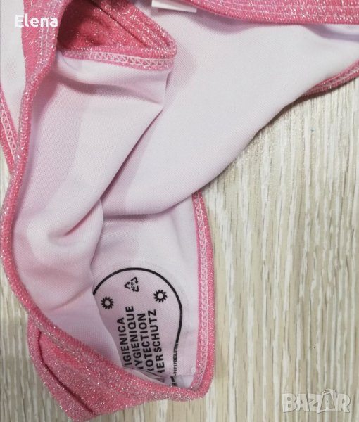 Бански костюм от 2 части,в нежно розов цвят и брокатени елементи. Горнището е тип триъгълници със свалящи се подплънки. Презрамките се регулират,както и долнището.