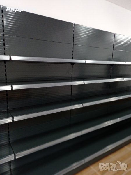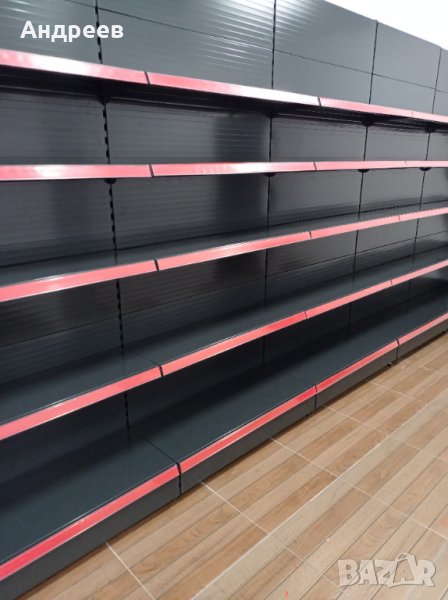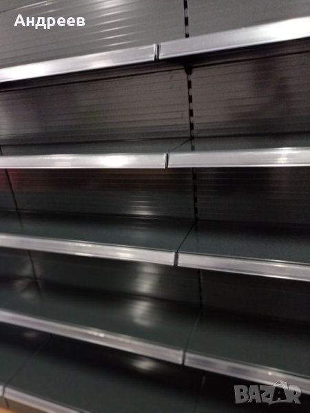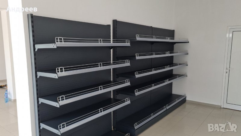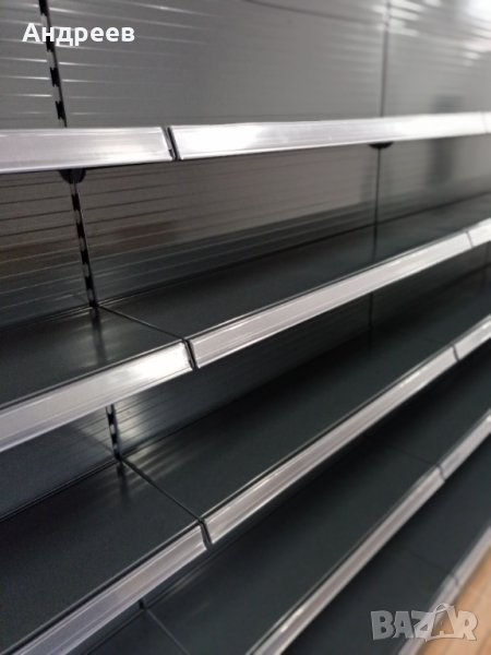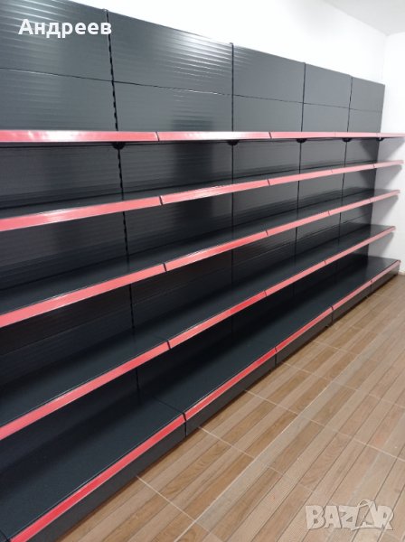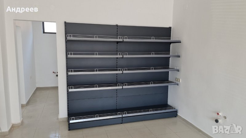 Крайстенни метални стелажи с височина 1,95м (2,25м), основен рафт 100х40см. и четири допълнителни рафта 100х30см., плътни гърбове, ценови ленти, колона с пета и декоративно чело - долно. Рафтовете може да бъдат повече или по-малко на брой, гърба може да бъде плътен или перфориран.