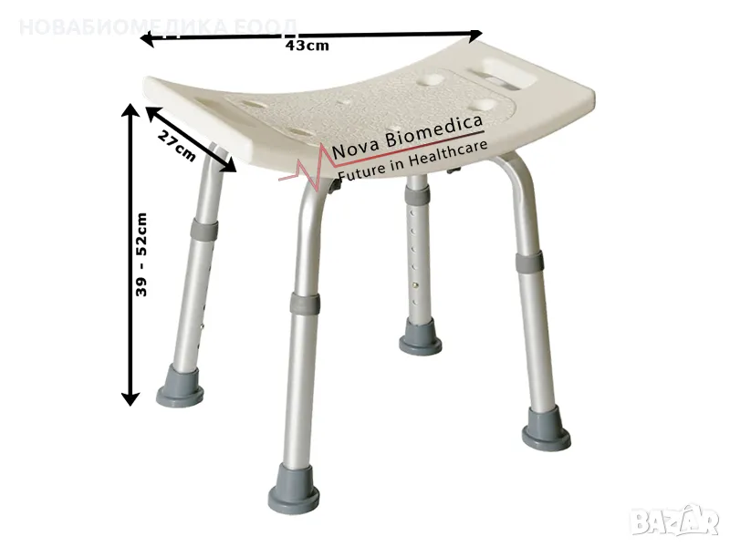Ако искате да гарантирате безопасността на вашия възрастен роднина, докато ползва банята, е добра идея да закупите пластмасово столче за баня, предназначено специално за стари хора. Столче за баня с алуминиеви крака и гумени накрайници, които предотвратяват плъзгане, като се регулира от 39 до 52 сантиметра и може да издържи до 115 килограма.
